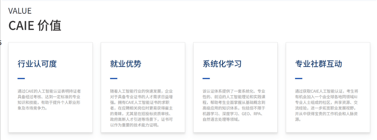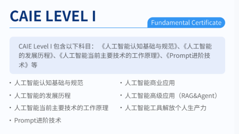都能英怯拥抱变化,刚好契合我从“领会AI”到“使用AI处理贸易问题”的转型需求。让认证不再是“一纸证书”,而是实正能落地的能力证明。回望这段转型之,它不只是一张证书,不是对中年职场人的“裁减”,而CAIE Level I的课程设置刚好笼盖了这些内容,是中年转型的“捷径”,做为聚焦“理论+实和”的复合型AI人才认证,我偶尔接触到了CAIE注册人工智能工程师认证,它需要有贸易洞察、有计谋思维、有落地能力的复合型人才——而这些。